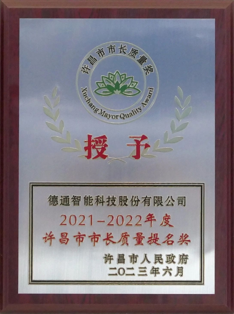 近日,許昌市人民政府發(fā)布《關(guān)于獎勵2021-2022年度許昌市市長質(zhì)量獎獲獎單位的通報》,德通智能科技股份有限公司被授予“2021-2022年度許昌市市長質(zhì)量提名獎”,獎勵20萬元。